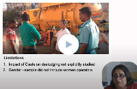 Sanitation workers are constantly exposed to different forms of waste and prone to many physical injuries. Hence, the programme identified safety concerns faced by de-sludging operators and field tested a set of interventions for improving worker safety. The proposed interventions go beyond the provision of Personal Protective Equipment (PPE), and range from behaviour change campaigns, improvements in decanting stations to better access to appropriately designed safety tools etc. Additionally, trainings on first aid and manuals for safe operating procedures are in the pipeline for worker safety.